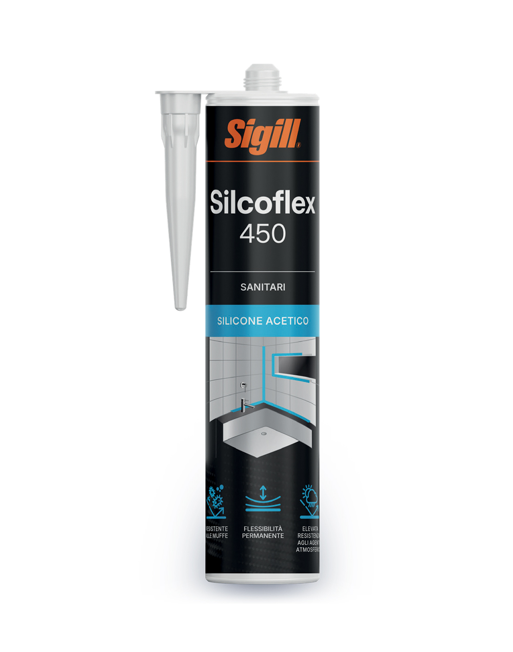 Silcoflex 450 è un sigillante siliconico monocomponente a reticolazione acetica per sigillature generiche. Polimerizza a temperatura ambiente sotto l’azione dell’umidità atmosferica per creare un elastomero siliconico permanentemente flessibile con elevata resistenza chimica e all’invecchiamento.