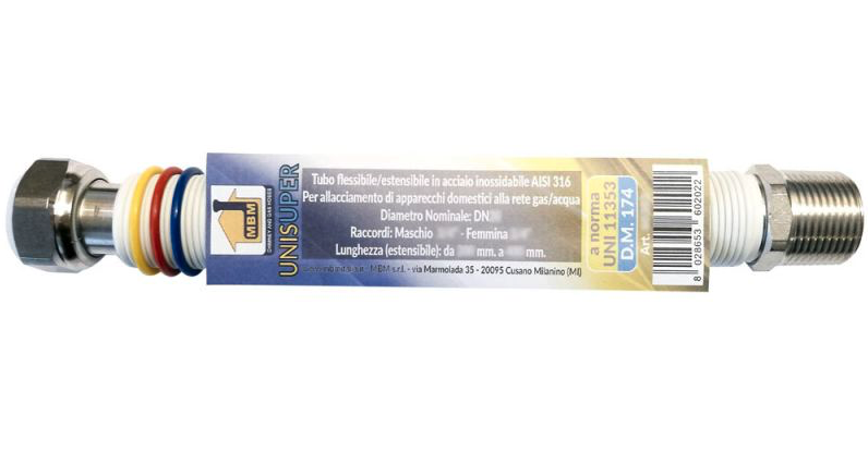 Tubo flessibile acqua o gas estensibile in acciaio inox a norma UNI11353 DM 174. Rivestito con guaina bianca e tre anelli identificativi per l’ uso.